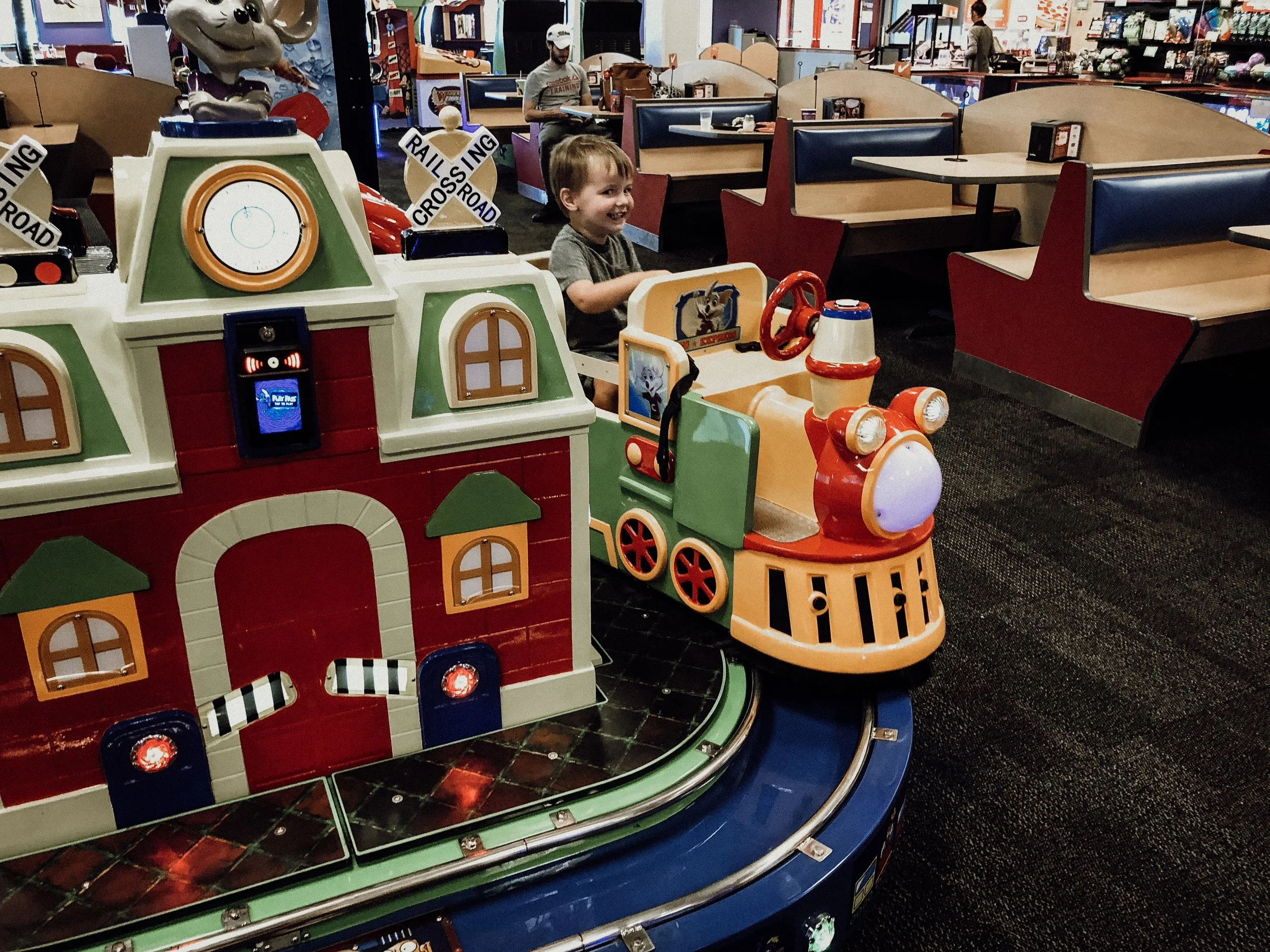 Somehow, we all slept in until about 10:30-11. Since it was so late and rain was in the forecast, we decided to take Z to Chuck E Cheese for the afternoon. The last time we went, was last year at our annual beach trip. He seemed to enjoy the games a lot more this time! He loved getting tickets after each game and throwing them in his bag. We took him to the prize wall and told him to pick out a prize (teaching moment of setting a goal and going after it... hahaha) so we knew how many tickets to try for. Of course, he picked the huge dinosaur at the top that cost 2500 tickets. At the time, we only had about 200 so we sent Roro and Daddy off to play some serious games and rack up some tickets for us! 😝 I think they had more fun than Z! After about 3 hours (yes, for real)... we had about 2000 tickets so we called it a day and got our beloved dinosaur! Zeke still threw a fit when we had to leave, but he apologized and was ready to drive off when we finally got loaded.