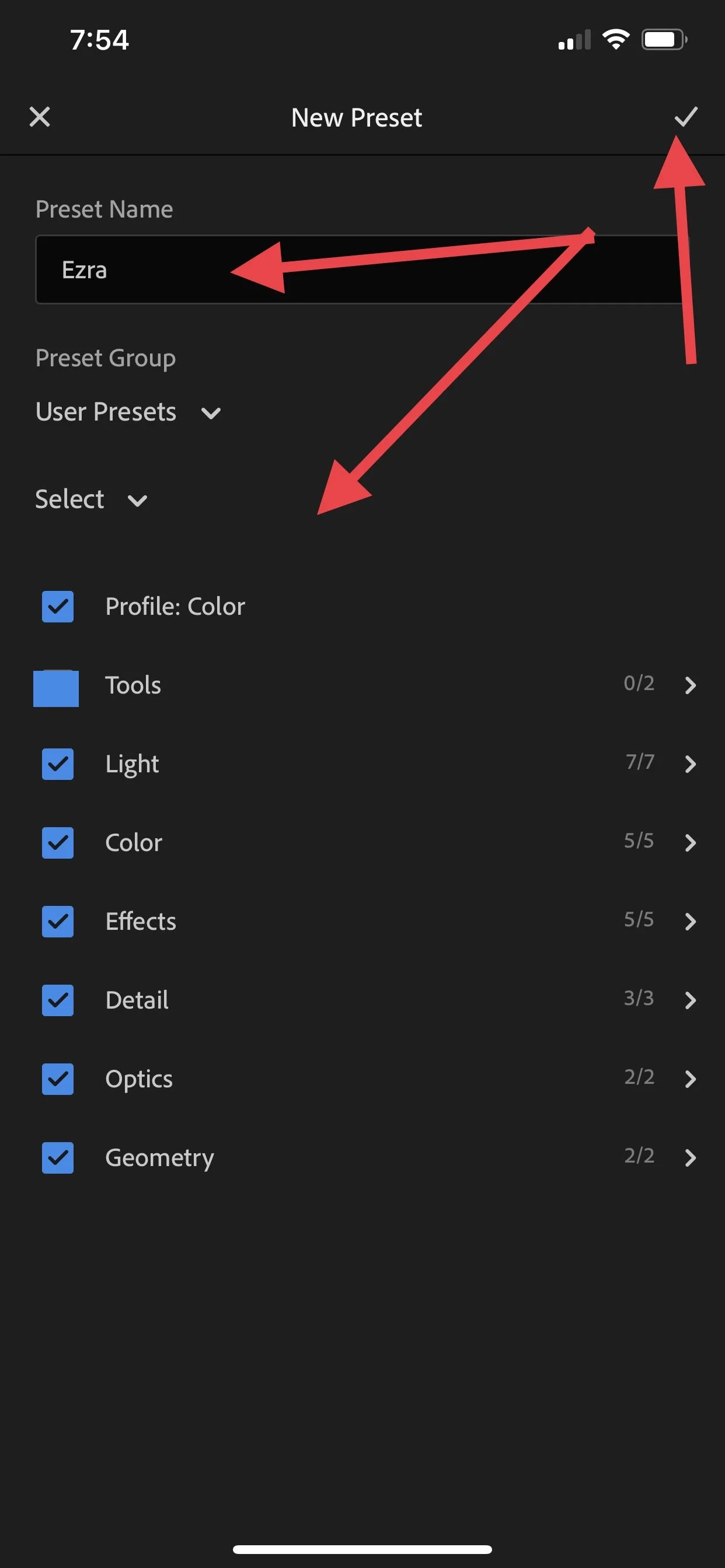 Step Three: Select the Preset you’d like to apply (make sure you are under the “User Presets” folder), click the check to save.